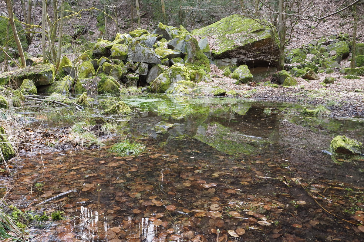 Erhaltung als Laichzone für Bergmolch, Grasfosch und Edkröte, Wasserstand von ca. 25 cm am Einlauf sicher stellen